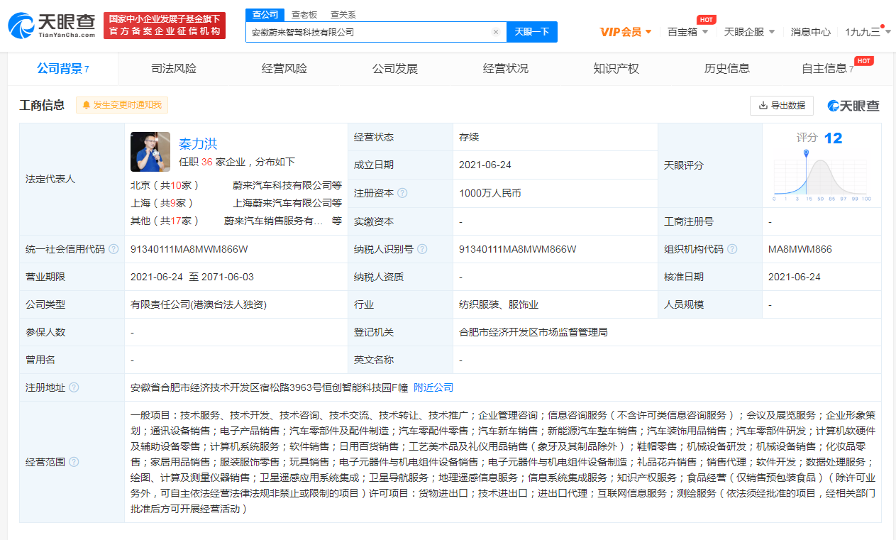 据天眼查APP显示,近日,安徽蔚来智驾科技有限公司成立,法定代表人为秦力洪,注册资本1000万人民币,经营范围包括新能源汽车整车销售;汽车零部件研发;机械设备研发;卫星遥感应用系统集成;互联网信息服务等,股东信息显示,该公司由香港蔚来智行有限公司全资持股。
