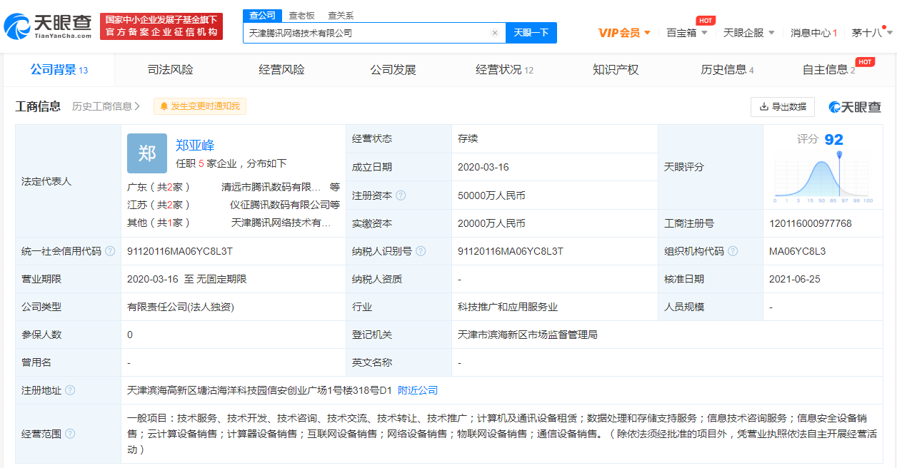 据天眼查APP显示,近日,天津腾讯网络技术有限公司注册资本由2亿人民币增至5亿人民币,增幅150%。经营范围新增信息安全设备销售、云计算设备销售等。天津腾讯网络技术有限公司成立于2020年3月,该公司由腾讯科技(北京)有限公司100%持股。