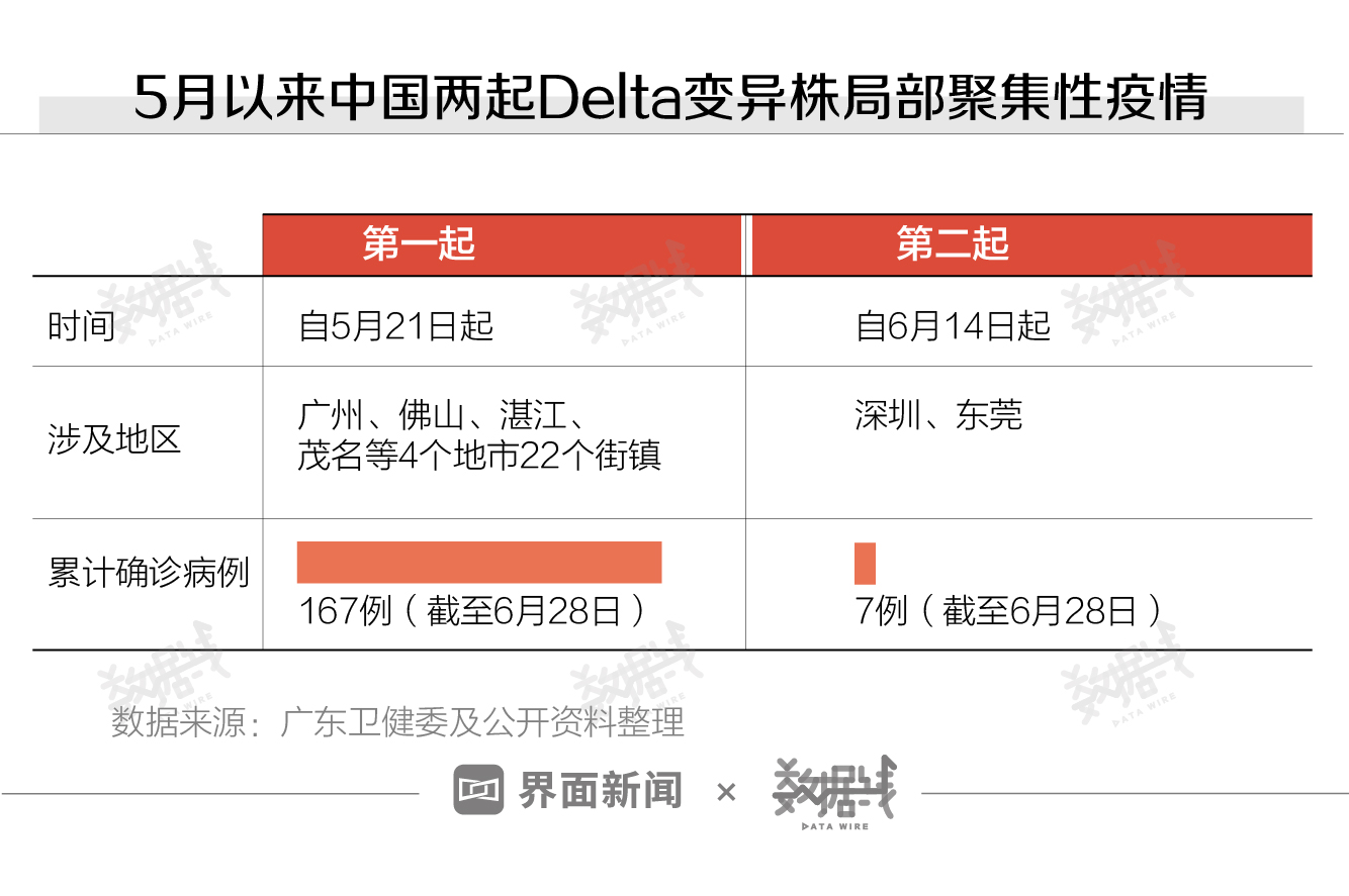 在中国,过去一个月来累计发生三起由变异株引发的本土聚集性疫情。其中,“5月21日广州荔湾区及相关地市”疫情、“6月14日深圳、东莞疫情”两起疫情均涉Delta变异株。截至6月28日,两起Delta变异株疫情分别累计确诊167例、7例,均为局部性疫情。
