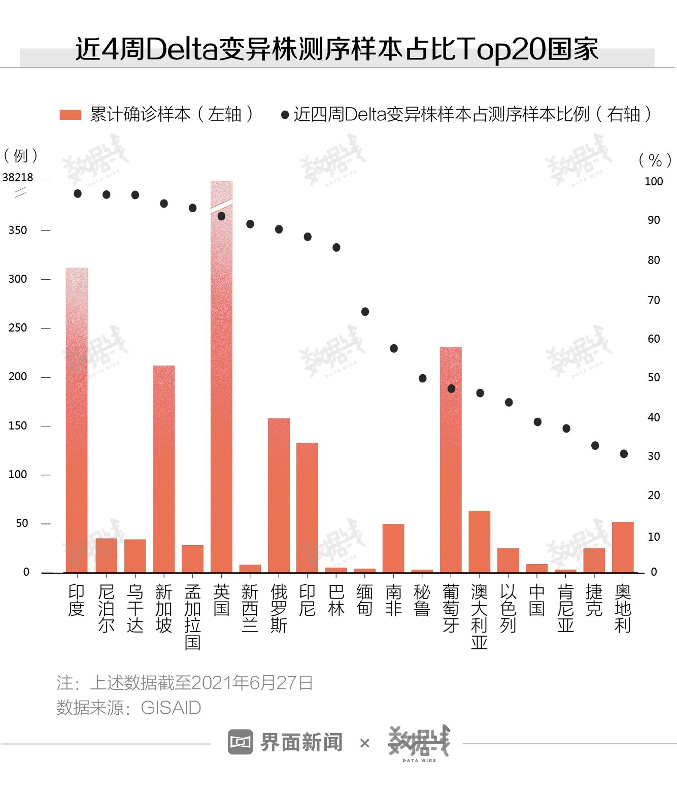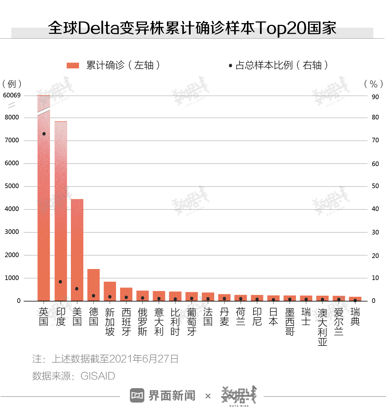 截至6月26日英国累计检测Delta变异株样本超6万例,在GISAID统计的79个国家、地区中居首位。
