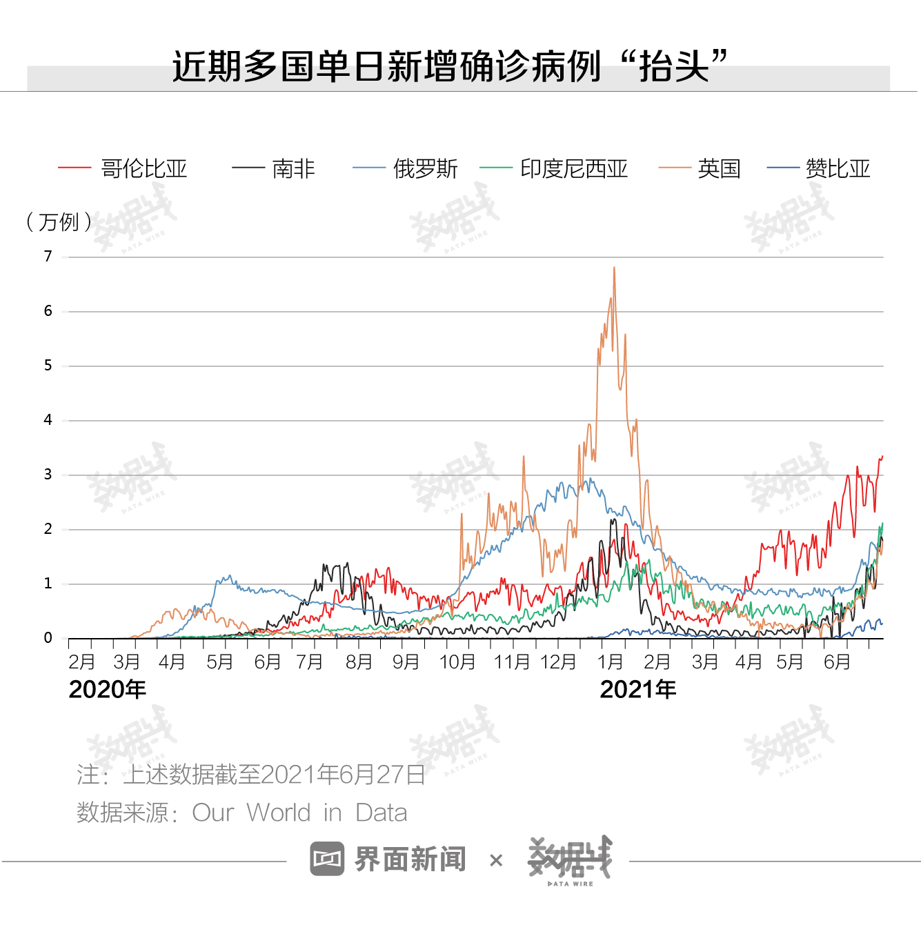Delta变异株让持续数月走低的全球疫情在6月底反弹。其中,哥伦比亚、南非、俄罗斯等多国疫情反扑明显。