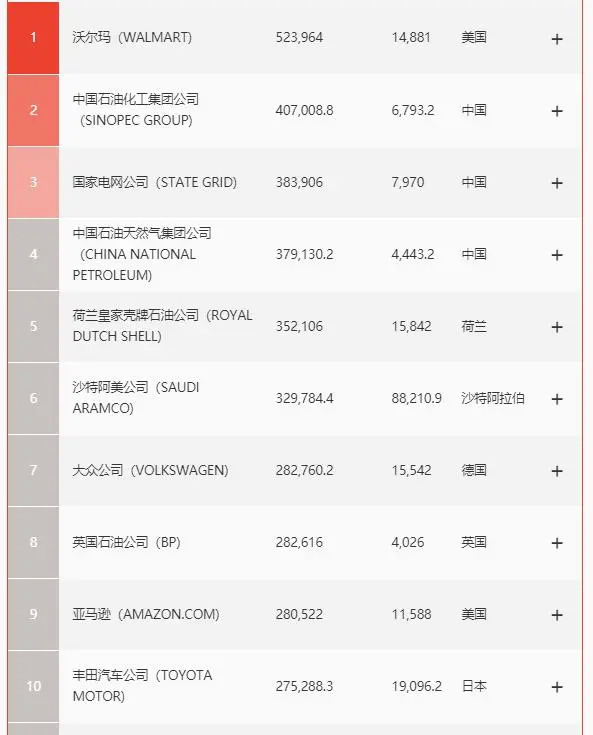 2020年世界500强排行榜前十