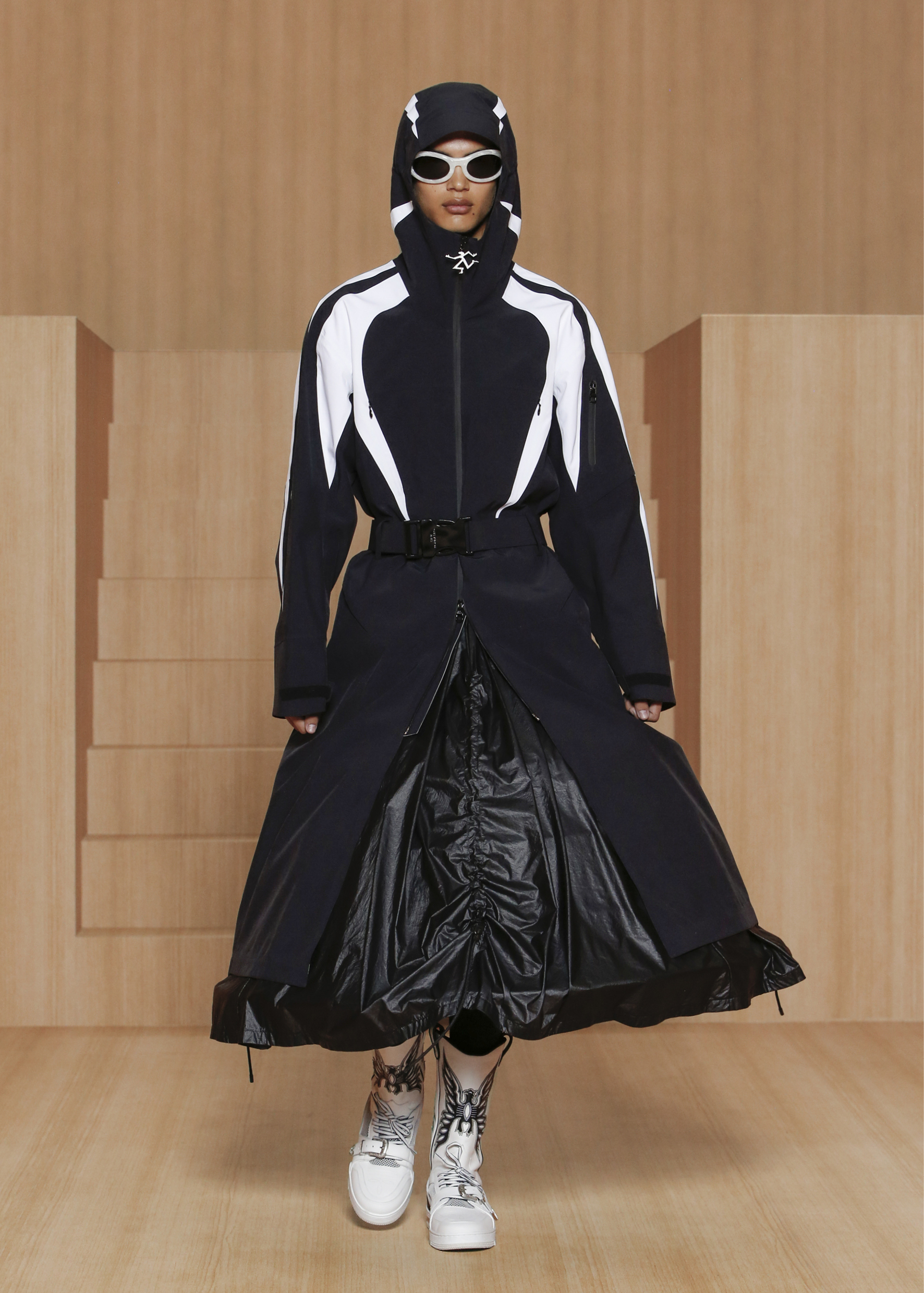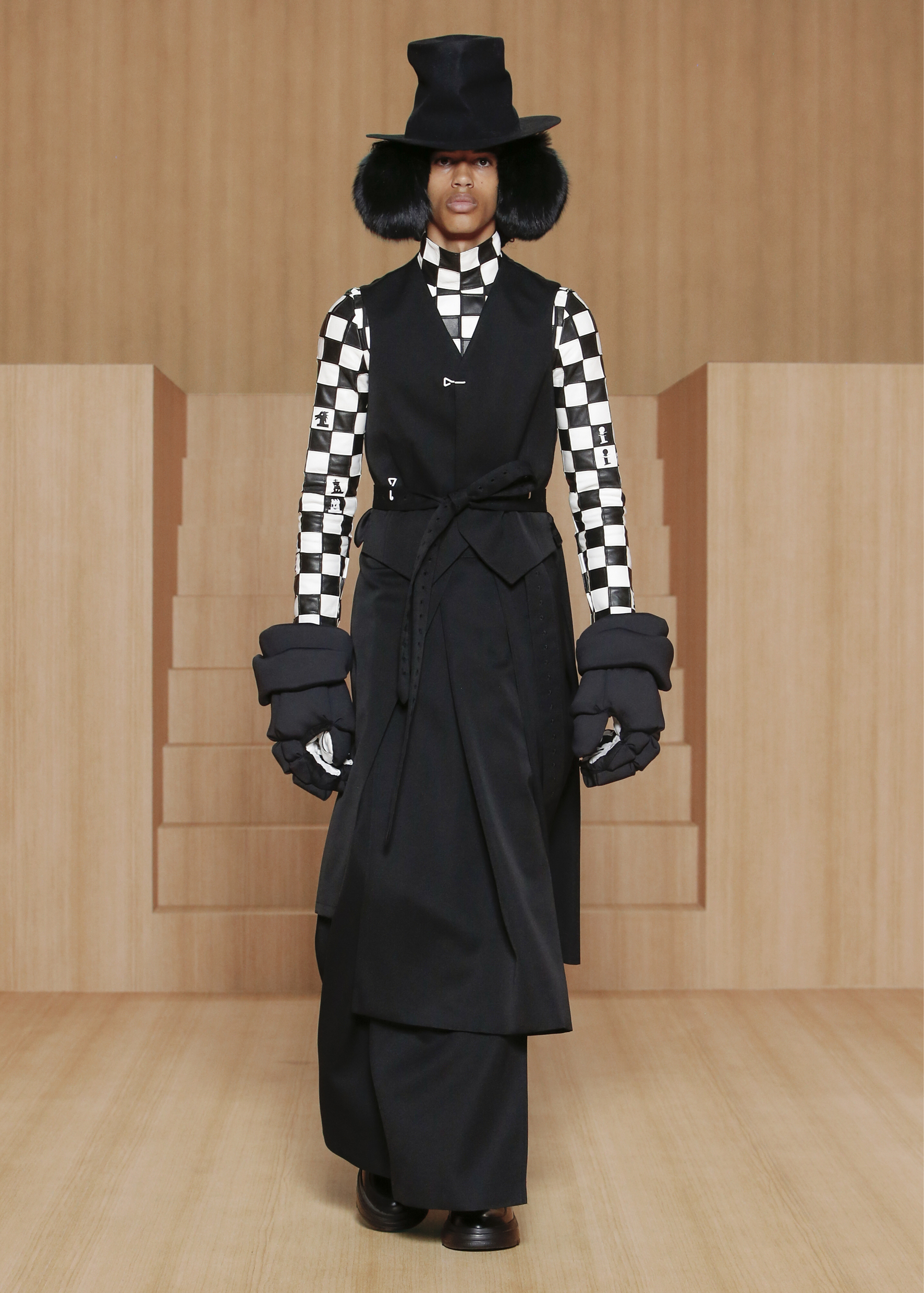 棋盘格也出现在历史上众多文化和亚文化美学中,与锐舞的视觉代码和Virgil Abloh的丰富造型相呼应。本季的多种元素皆从国际象棋图形中汲取灵感,而棋盘格纹亦体现在裙子、帽子和手套造型中。
