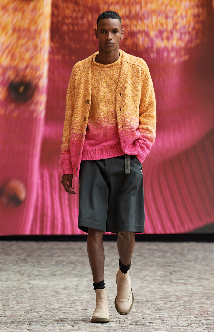 本系列的色彩运用也成为一大亮点。青瓷绿、海藻绿、巧克力色和碳灰色与柔和的暗淡玫瑰色、石灰色和生丝色石相融合。一款明亮、柔软的毛衣,一款雏菊图案装饰的宽松百慕大短裤正体现了这种自由的松弛感。这个充满创意的系列洋溢着乐观和活力,仿佛一个重生的世界,迸发出蓬勃朝气。