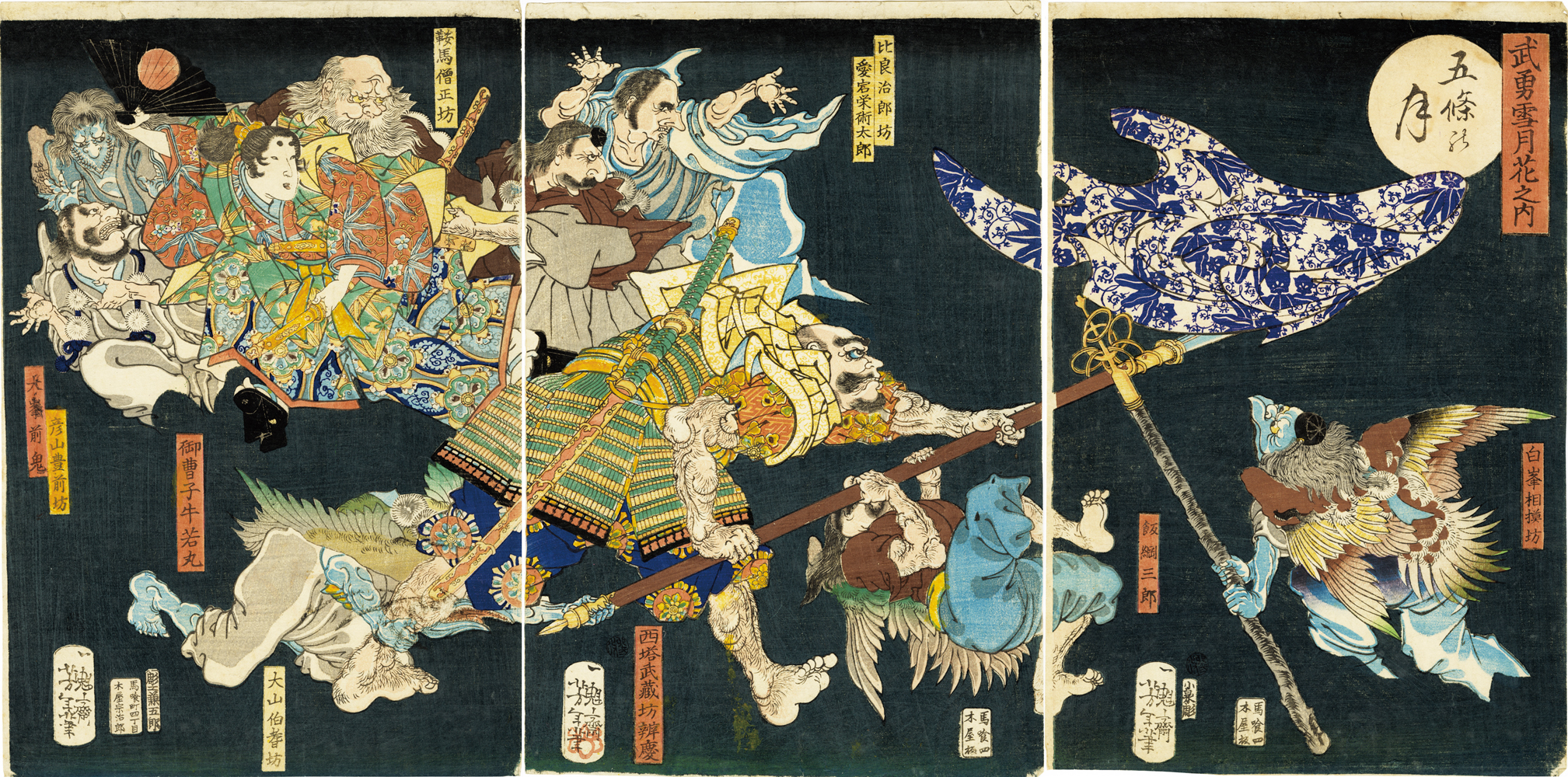月冈芳年所绘的《雪月花之内》就展现了人与天狗同在的一幕。这幅画以“五条大桥上牛若丸和弁庆相遇的传说”为主题进行的创作,牛若丸是日本传奇英雄源义经的幼名,相传牛若丸7岁时曾被送到鞍马寺学习,某夜他偷溜出寺,遇到了武艺高强的大天狗之一“鞍马山僧正坊”,之后,牛若丸便常常夜遁至大天狗处学习武艺。某日,在回寺的路上,他途经五条大桥时遇见一位自称武藏坊弁庆的武勇僧侣拦路,两人展开了激烈的比拼。月冈芳年所绘的便是两人打斗的场景,围绕在它们身边的正是八位有姓名的大天狗。