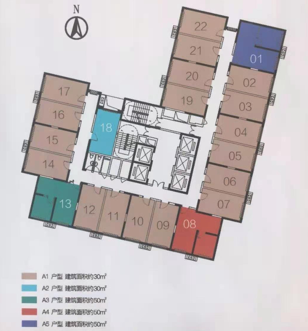 中海创客大厦户型分布为U型动线,5梯22户配置,人性化的设计细节,让公寓也有了不错的私密性和体验感。