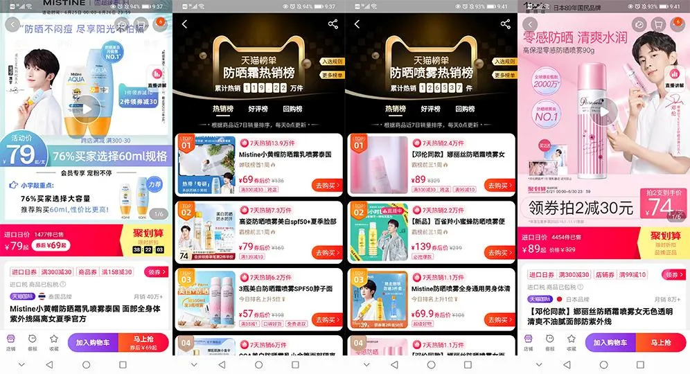 同样,在天猫618期间,Mistine小黄帽防晒霜累积销售近40万,位于防晒霜销售榜NO.1;娜丽丝防晒喷雾以累积销售近8万,位居防晒喷雾销售榜NO.1。资生堂品牌斩获高端防晒日系水乳NO.1,安热沙则是防晒品牌、防晒店铺、防晒单品NO.1。