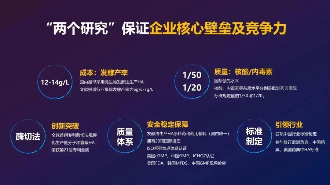 自从采取微生物发酵法后,透明质酸的产量得到快速增长,华熙生物生产的透明质酸也开始出口到日本以及欧美等国,2007年成为全球规模最大的透明质酸生产商。正是通过技术与资质壁垒,华熙生物目前坐稳了玻尿酸行业老大的地位,快速反超欧美日韩等国、引领全球,全面实现"国产替代",推动行业实现高质量发展,也产生了巨大的经济效益。