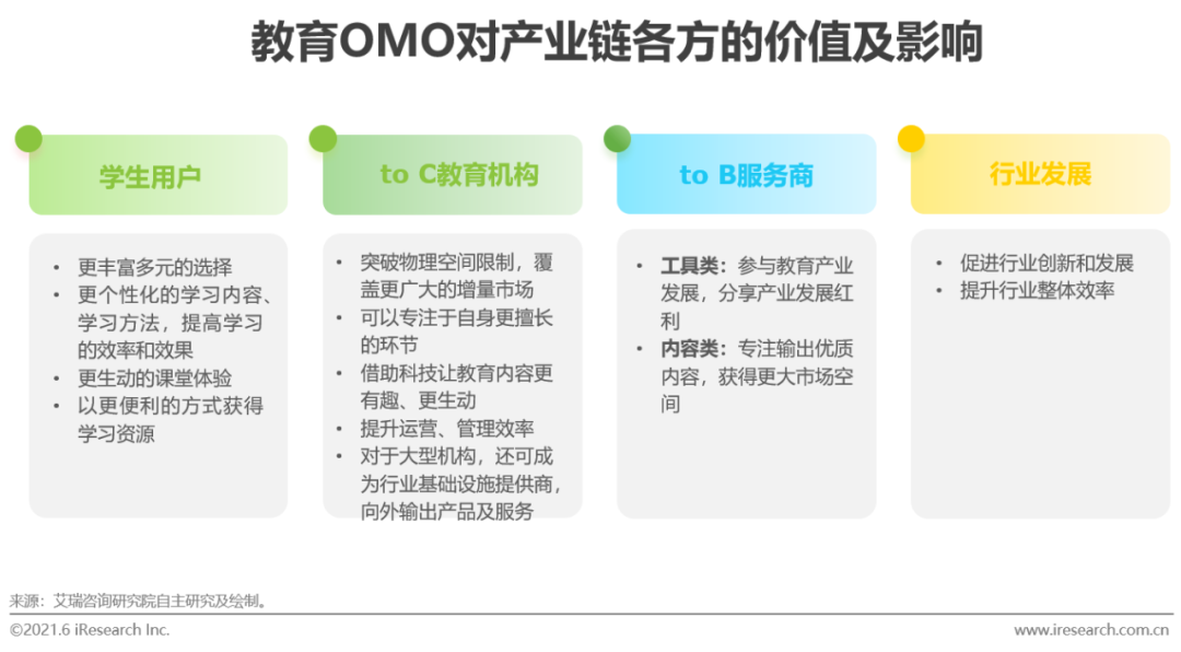 当前,各行各业都开始受数字化、智能化的赋能或颠覆,教育行业也不无例外的处于数字化旋涡之中。数字化、智能化赋能的更有效率的产品呈现及交付方式以及更有效率更科学的运营管理模式正对传统的教育企业经营模式发起冲击,教育OMO作为教育与科技融合的业务形态,将推动整个教育行业商业模式的创新和发展,提升行业整体效率。