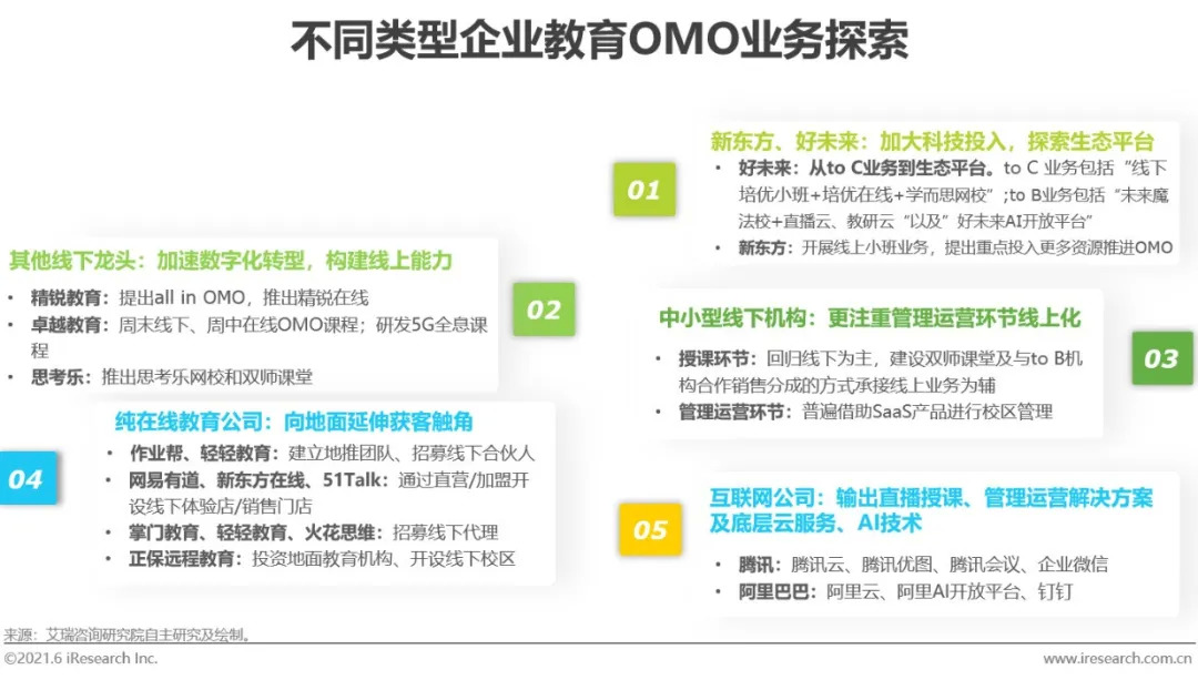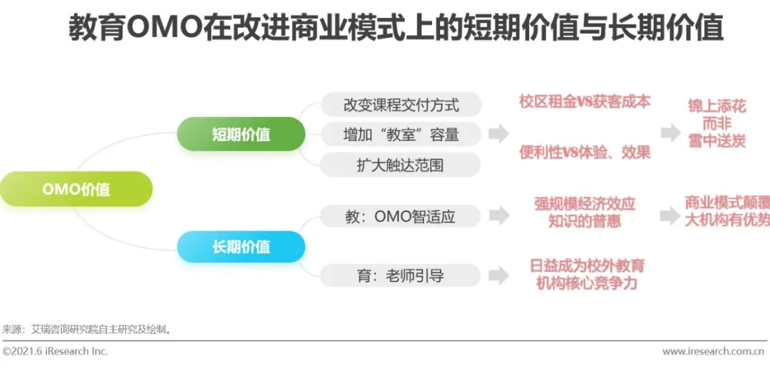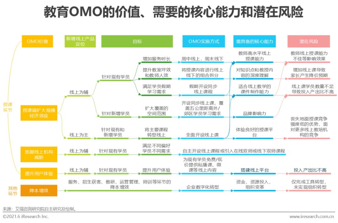 短期看,OMO并不能为地面教育机构雪中送碳,也很难通过增加线上授课实现困境反转,但通过线上能力的嫁接,可以在一定程度上和地面教育进行优势互补,提升运营效率。但OMO的实施也伴随一定风险,如线上部分如何定位、与地面教育是否会产生冲突等等,需要机构结合自身情况综合考虑。