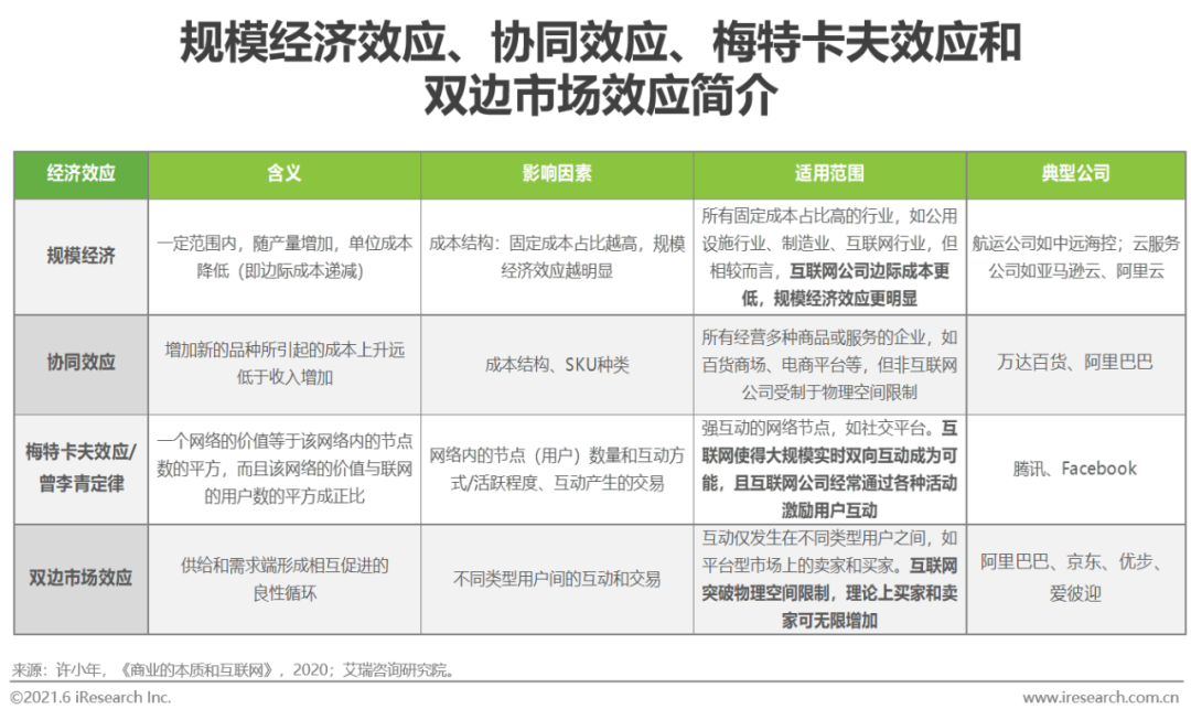 一般而言,梅特卡夫效应最强,具备相应效应的企业价值是指数级的增长,其次是双边市场效应,再次是规模经济效应及协同效应。但在互联网已成为基础设施的信息时代,真正决定企业到底具备哪些经济效应以及其发展速度和价值的是其商业模式及互联网对上述四个经济效应的放大效果的强弱,本质仍在于其所处的行业的市场空间及其自身的商业模式,而非是否通过网络提供服务,如非平权的微博的梅特卡夫效应远低于更平权的微信、自营电商也完全不具备电商平台的双边市场效应。