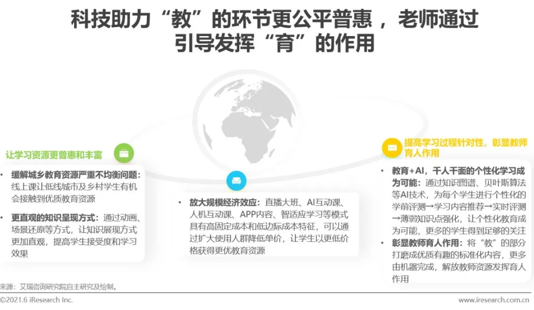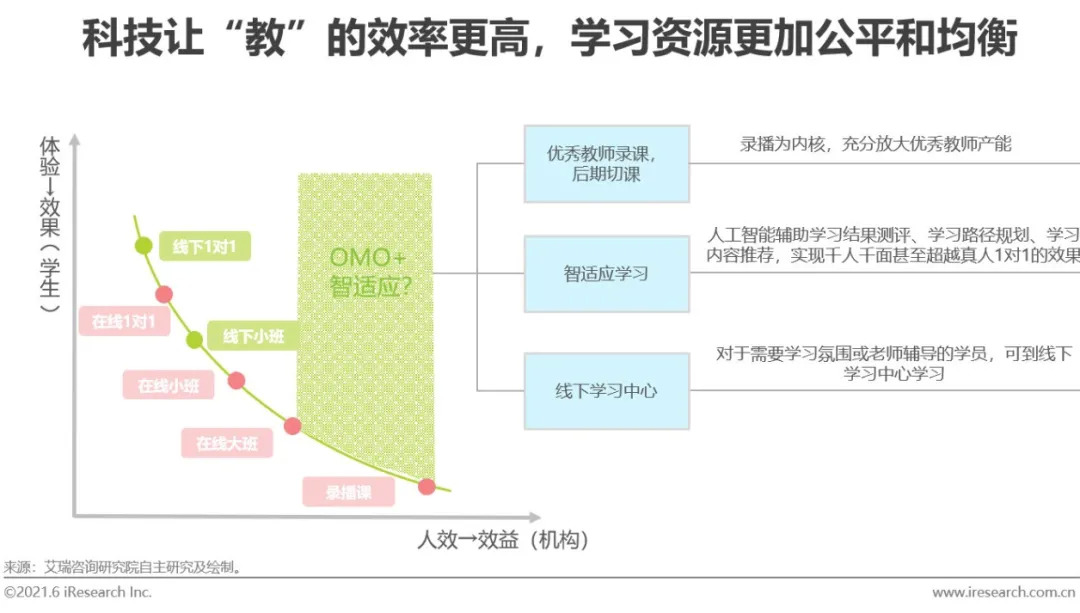 促进教学资源普惠的深层价值:政策推动,公立校、社会机构协作,通过OMO+智适应促进教学资源普惠,校外培训机构将更多发挥“育”的功能;