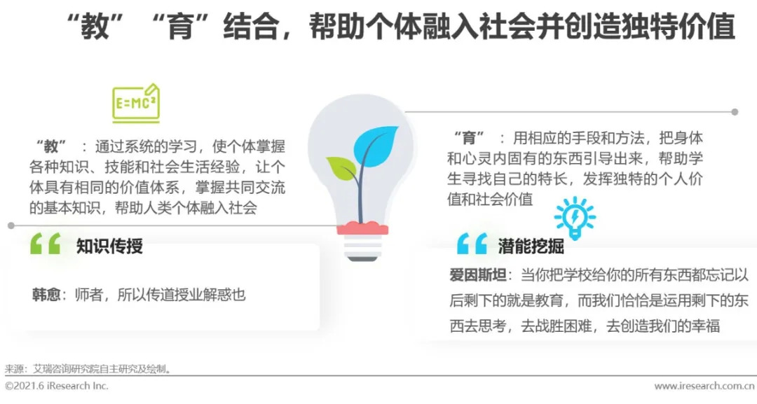 通过知识点的传授,可以让学生具有相同的价值体系,掌握共同交流的基本知识,帮助人类个体融入社会;而通过对个体潜能的发掘和引导,可以帮助学生寻找自己的特长,发挥独特的个人价值和社会价值。结合来看,“教育”就是传授外部的知识的同时,激发和引导学生个体内在的潜能。