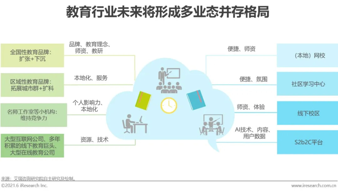 多业态并存的行业格局:全国性教育品牌、区域品牌、名师工作室等机构并存;(本地)网校、社区学习中心、线下校区等业态并存,但“纯线下”教培机构未来将不复存在;