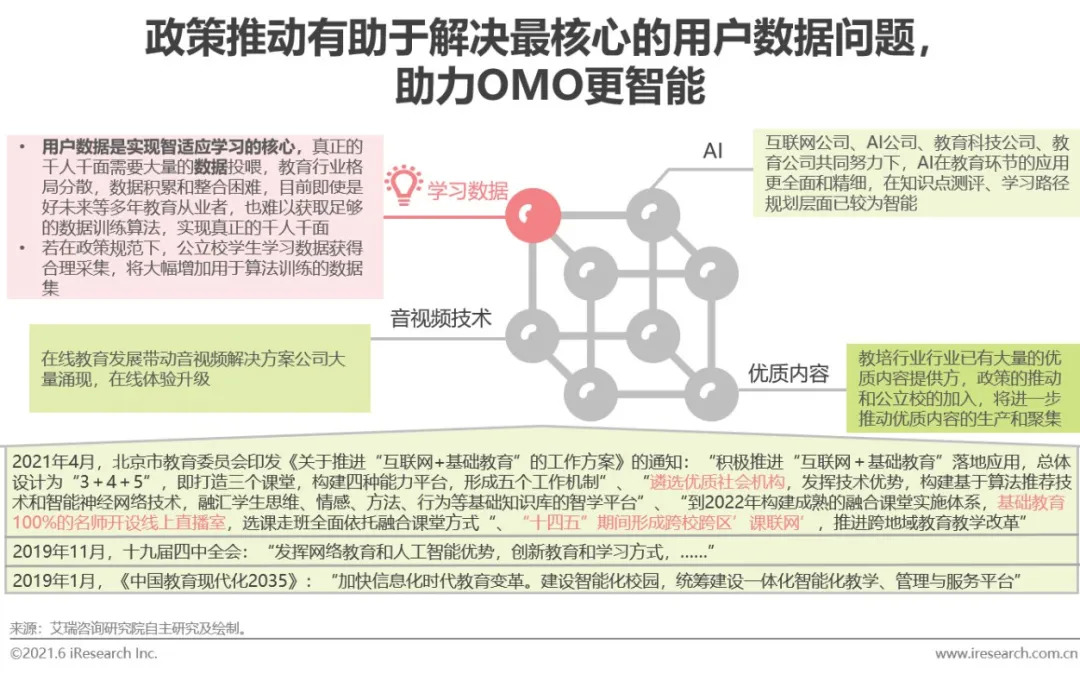 4月28日,北京市教委印发《关于推进“互联网+基础教育”的工作方案》的通知,提出了“3+4+5”的总体设计、“到2022年构建成熟的融合课堂实施体系,基础教育100%的名师开设线上直播室““遴选优质社会机构,发挥技术优势,构建……基础知识库的智学平台”的任务等推动智适应学习和线上线下融合教学的相关举措。教育OMO将进一步走进公立校,并在社会机构的参与下获取更多的数据积累,最终形成更精细化、智能化的OMO模式,推动教学资源普惠的真正实现。