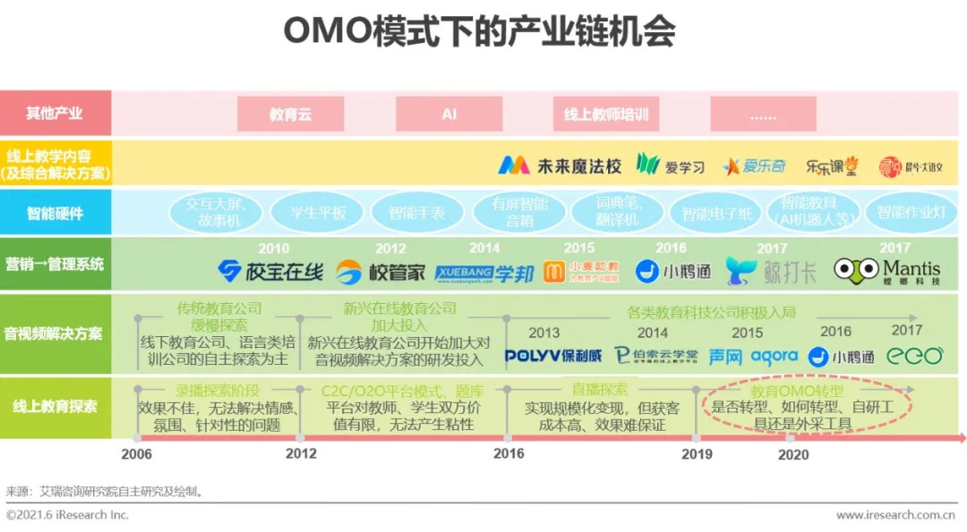 教育行业发展与零售有相似之处:在线教育发展带动行业基础设施完善,如音视频解决方案解决了远程上课和互动(类似零售的物流)问题,线上教学内容解决了优质师资缺乏问题、营销管理系统让获客和管理更加高效……随之产生更高阶的OMO业态。伴随着越来越多教育公司OMO转型的深入,其相关基础设施产业也将迎来更快速的增长。