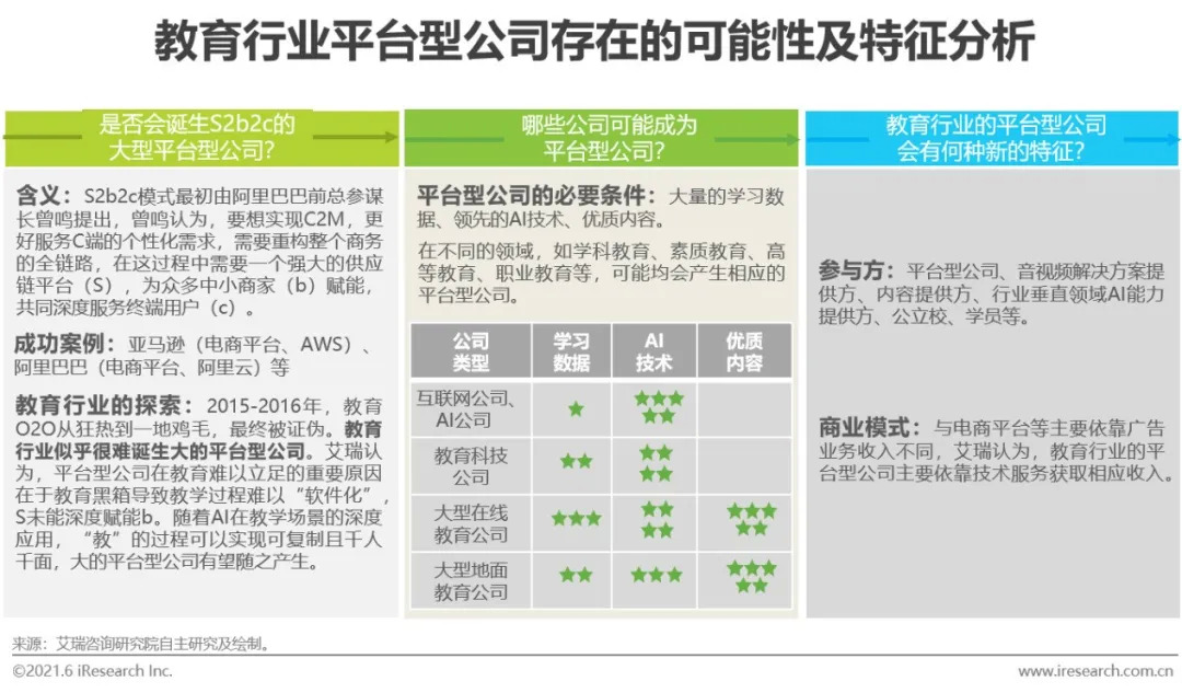 电商发展过程中产生了阿里巴巴这一大型行业基础设施平台,但教育领域的平台型模式貌似已被证伪,虽然好未来、爱学习等开始探索S2b2c的基础设施服务商角色,但推进过程并不顺利。与零售不同,教育过程和结果的关系仍是黑箱,自动化进程十分缓慢,核心教学过程的“软件化”难度高、个性化强,导致了大行业、小公司的现状。预计随着更多学习过程数据的采集,智适应教学普遍推广,S能深度赋能b端时,教育领域的基础设施服务商将会有更大发展空间。