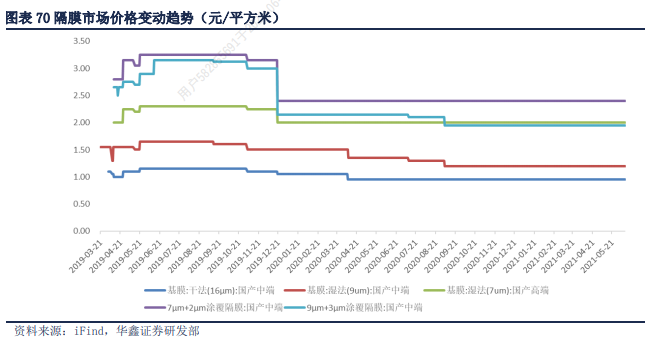 华鑫证券研报显示,2019年锂电池隔膜部分产品价格出现断崖式下跌,且2020年仍有小幅下跌的情形。