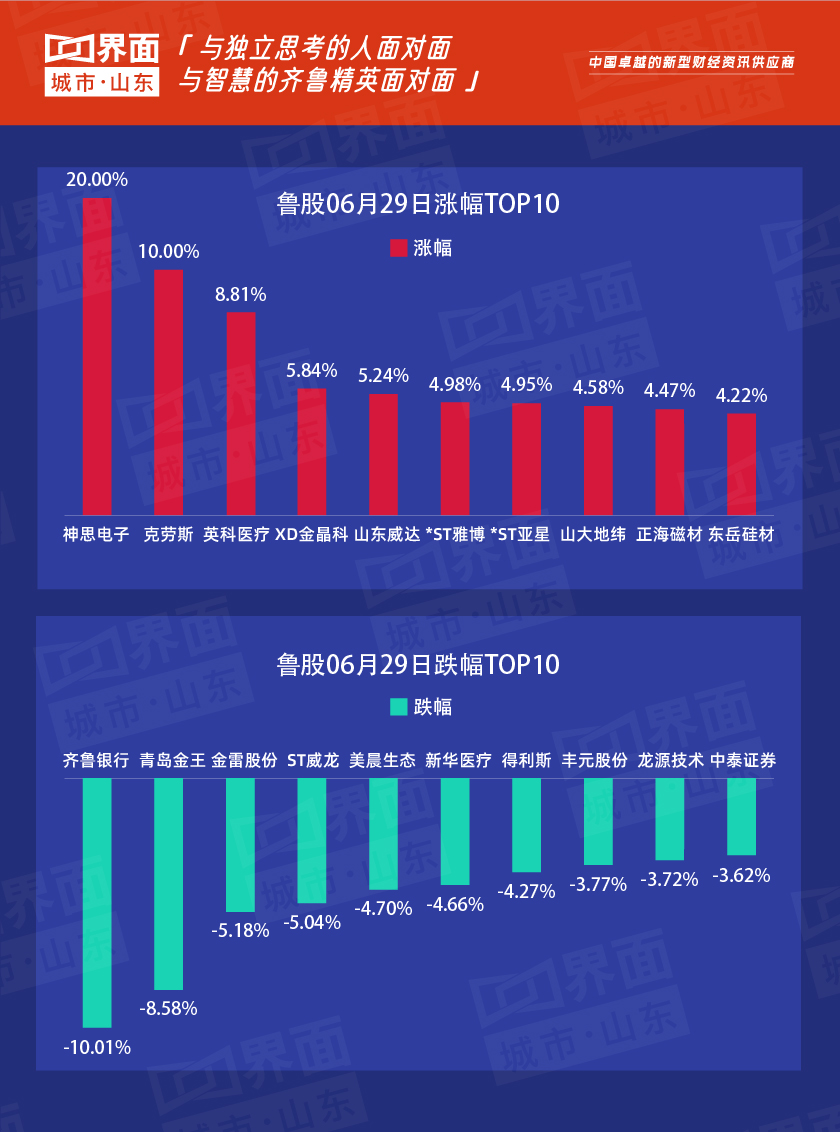 6月29日,山东61股上涨,2股持平,176股下跌。
