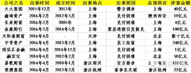 其它几家中,鑫琦资产、长来财富、天恒泰财富、融宜宝等4家公司是由资金链断裂引发了兑付危机,国弘汇金融疑似受到大大集团牵累而步其后尘,金鹿财行出现危机直接肇因于《叶问3》的票房造假案,员工高调炫富让中晋资产惹火烧身,而望洲集团的危机则触因于公司董事长的一场新疆戈壁自驾游。
