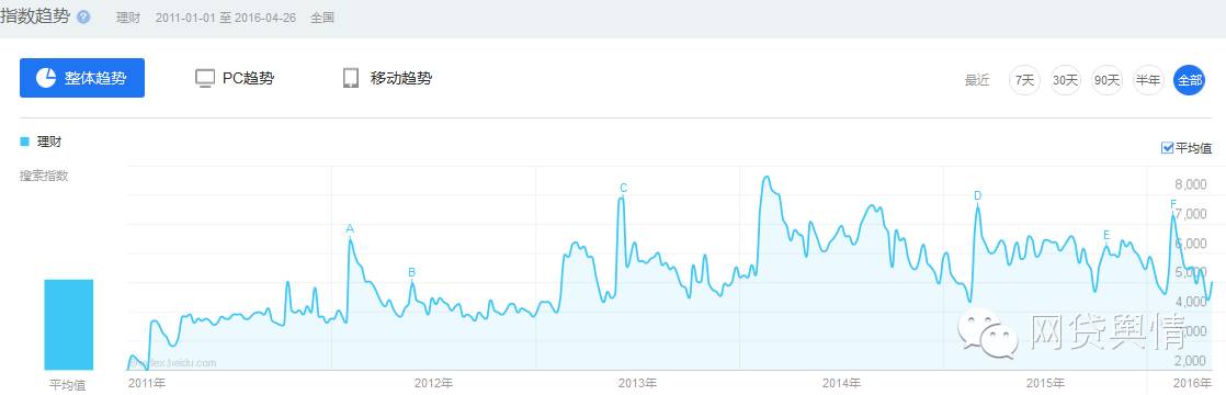 这些线下理财公司能够扎堆出现,并非凭空出世,背后有强大的国民理财需求在支撑。这可从“理财”一词的百度指数变化中窥其一斑。从下图可轻易看到,“理财”一词前后的热度变化相当明显,以2011年、2012年、2013年与其后的时段相比,则这种变化会表现得更为扎眼。