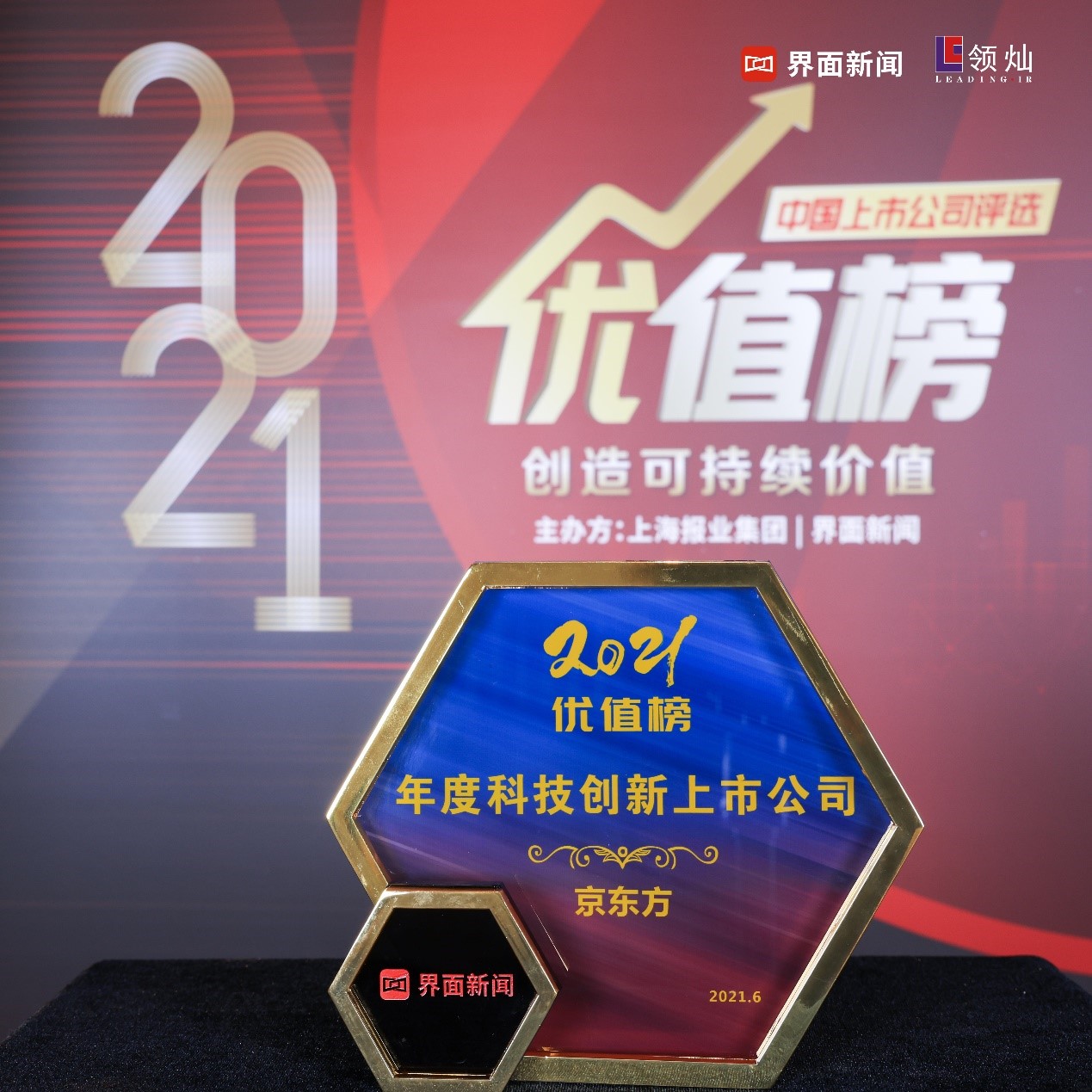 6月30日,由上海报业集团 | 界面新闻发起的2021【优值榜】颁奖盛典在上海小南国花园酒店圆满落幕。近200家上市公司高管、资本行业专家们齐聚一堂,现场见证上市公司年度荣耀揭晓。京东方(000725.SZ)凭借“市场表现、创新发展、治理能力、社会责任”等方面的亮眼表现,实至名归荣获“年度科技创新上市公司”大奖。