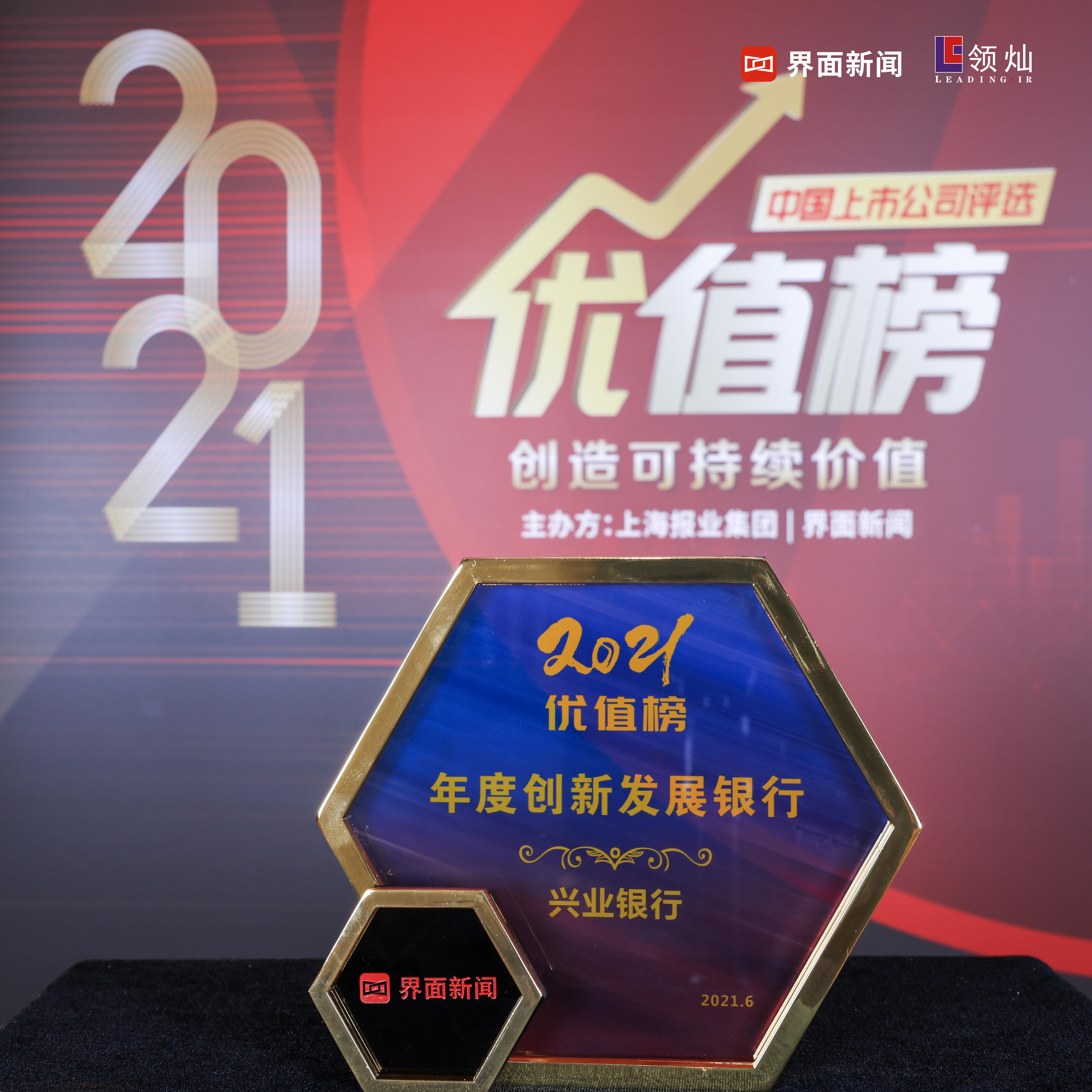 6月30日,由上海报业集团 | 界面新闻发起的2021【优值榜】颁奖盛典在上海小南国花园酒店圆满落幕。近200家上市公司高管、资本行业专家们齐聚一堂,现场见证上市公司年度荣耀揭晓。兴业银行(601166.SH)凭借“市场表现、创新发展、治理能力、社会责任”等方面的亮眼表现,实至名归荣获“年度创新发展银行”大奖。