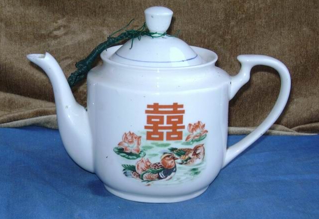 祖父生活节俭,喝茶亦是如此。泡在一个印着红双喜的瓷茶壶里,用一个白瓷小杯倒出来喝。一次要放多半壶茶叶。喝得很慢,喝一口,还得回味一下。有时候一壶茶就是喝上两天,完了祖母还舍不得倒掉,直接搅进猪食之中,说猪吃了有益。