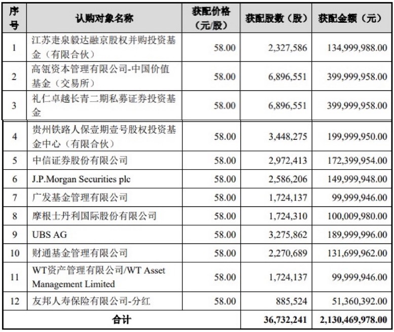 6月29日晚,汇川技术披露的《向特定对象发行股票发行情况报告书》显示, 公司此次定增价格为58.00元/股,募集资金合计21.30亿元。发行对象共有12家,包括高瓴资本、中信证券、UBS AG、J.P.Morgan等。