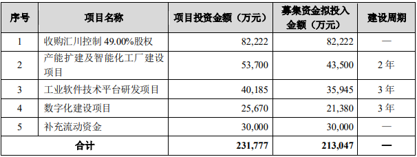 至于此次募集资金的用途,汇川技术称计划投入8.22亿元收购深圳市汇川控制技术有限公司(下称汇川控制)49.00%的股权,另计划分别投入4.35亿元、3.59亿元、2.14亿元至产能扩建及智能化工厂建设项目、工业软件技术平台研发项目、数字化建设项目,并拟用3亿元补充流动资金。