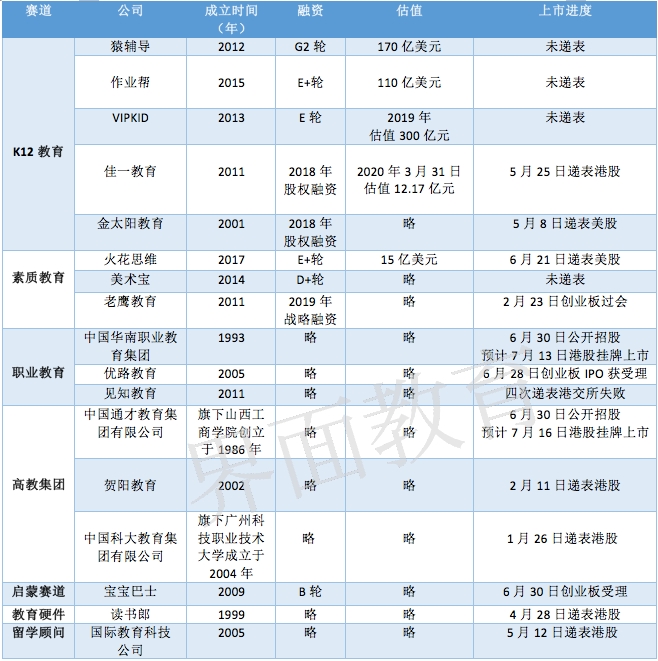 据界面教育不完全统计,目前排队上市的教育公司共有17家,其中K12教育有5家,包括传闻上市的猿辅导、作业帮、VIPKID,以及今年5月递表的佳一教育、金太阳教育。素质教育、职业教育、高教集团分别各有三家。启蒙赛道、教育硬件、留学赛道各有一家,分别为宝宝巴士、读书郎、国际教育科技公司。