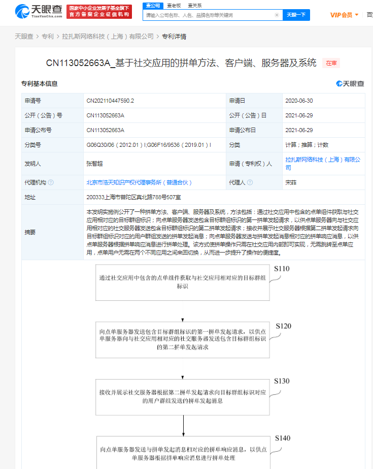 据天眼查APP显示,近日,饿了么关联公司拉扎斯网络科技(上海)有限公司公开“基于社交应用的拼单方法、客户端、服务器及系统”发明专利,公开号CN113052663A,申请日期为2020年6月。