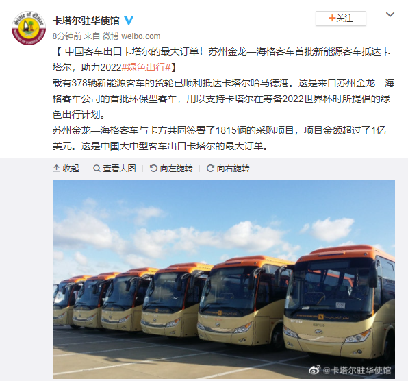 @卡塔尔驻华使馆 微博6月30日消息,载有378辆新能源客车的货轮已顺利抵达卡塔尔哈马德港。这是来自苏州金龙—海格客车公司的首批环保型客车,用以支持卡塔尔在筹备2022世界杯时所提倡的绿色出行计划。