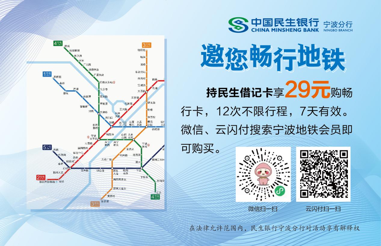 据了解,该活动持续至9月底,只需进入微信或云闪付搜索“宁波地铁会员”小程序,绑定民生银行借记卡即可购买29元地铁畅行卡,12次不限行程,7天有效。购买后,在“宁波地铁会员”小程序内点击乘车,进入相关地铁票页面,出现乘车码刷卡进出闸口。此外,在微信“宁波地铁会员”小程序内绑定民生银行借记卡还可享1分钱购2元小遛骑行券。