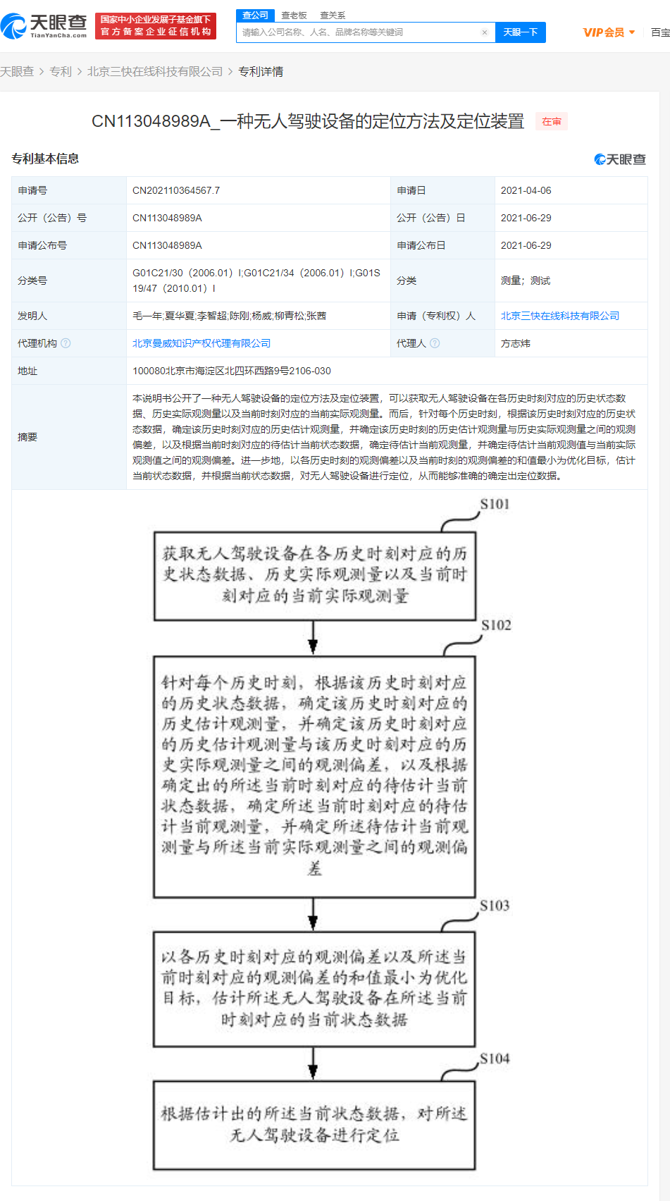 据天眼查APP显示,6月29日,美团关联公司北京三快在线科技有限公司公开“一种无人驾驶设备的定位方法及定位装置”专利,公开号为CN113048989A,申请日为2021年4月。
