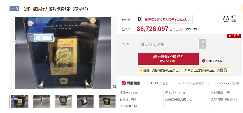 根据近期日本拍卖网站的成交价格来看,该游戏卡牌市值估价在20万左右,国内略贵,逼近28万。但这次近亿元的拍卖价格,实在是太离谱了。