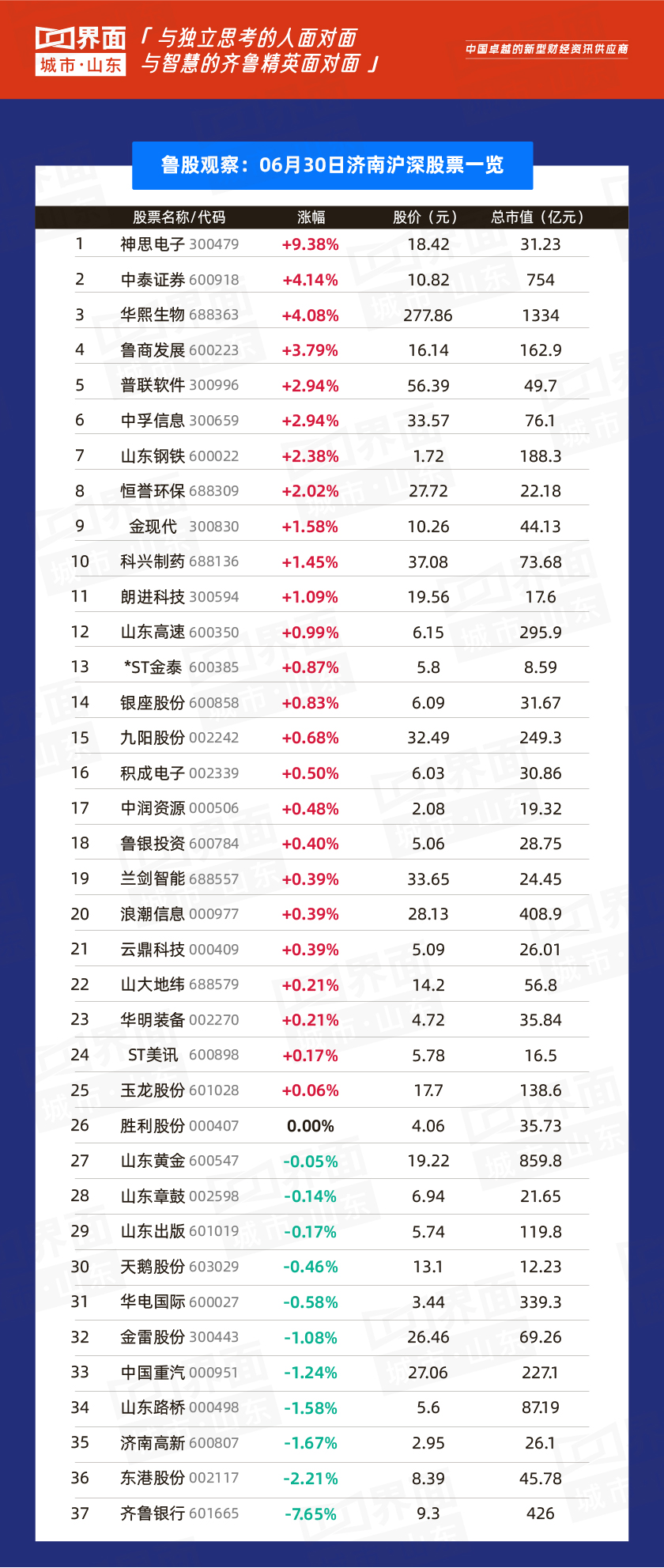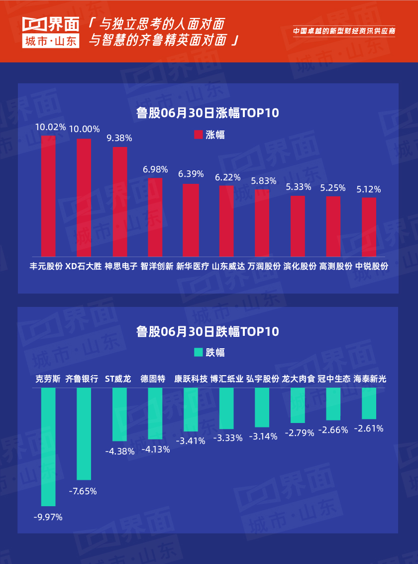6月30日,山东127只个股上涨,105只下跌,7只股持平。