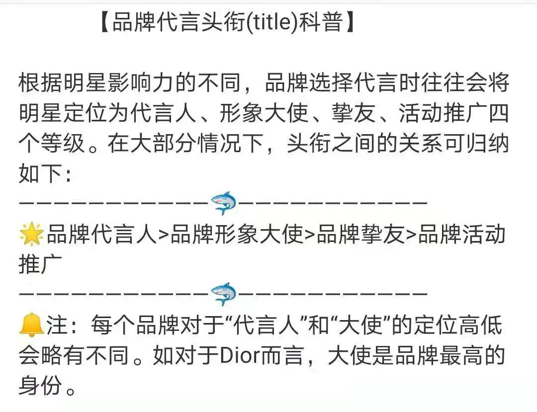 品牌在title问题上踩中粉丝雷区,但现实是,如今品牌又必须要给到明星一个title。因为对粉丝来说,有title会算作偶像的个人商务,没title只会算作简单的品牌推广,前者的价值和分量必然会远高于后者。
