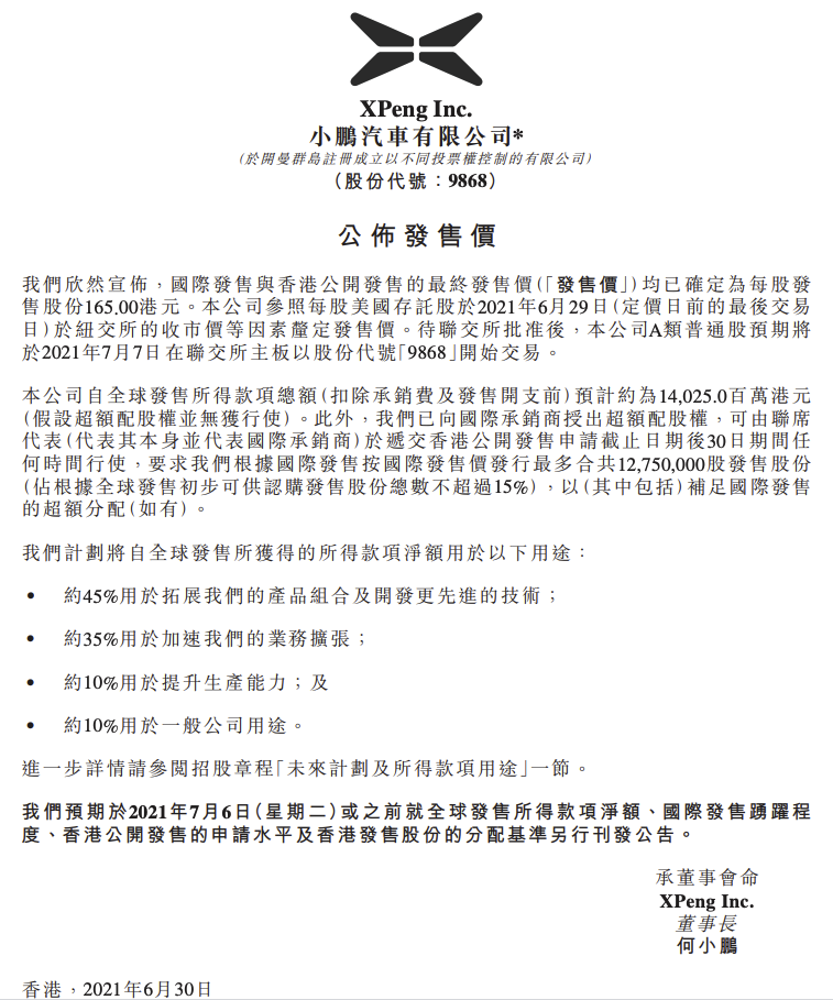 小鹏汽车6月30日晚在港交所公告,国际发售与香港公开发售的最终发售价均已确定为每股发售股份165.00港元。本公司参照每股美国存託股于2021年6月29日于纽交所的收市价等因素厘定发售价。待联交所批准后,本公司A类普通股预期将于2021年7月7日在联交所主板以股份代号“9868”开始交易。