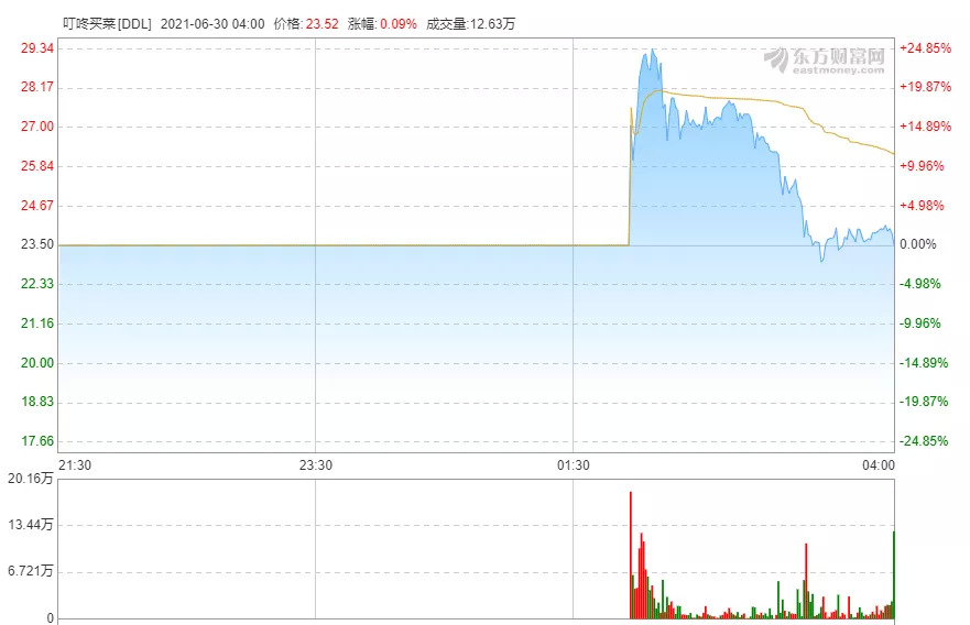 北京时间6月29日晚间,叮咚买菜正式在纽约证券交易所挂牌上市,开盘较发行价上涨19.14%,首日收盘微涨0.85%,总市值约55.86亿美元。