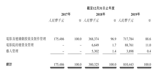 招股书显示,2017年耳东影业全部1.75亿元的收入均来自于影视剧投资与制作。2018年、2019年,影视剧投资与制作收入分别为3.68亿元、7.18亿元,占比分别为96.9%、88.6%。