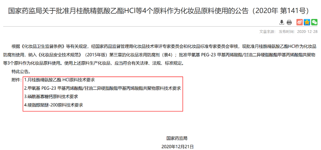 在中国化妆品新原料的审批之路并不易。据了解,化妆品新原料的更新已间隔十年之久,截止2020年12月21日,国家药品监督管理局公布了新增的4种化妆品新原料,即批准月桂酰精氨酸乙酯HCl作为化妆品防腐剂使用;批准甲氧基PEG-23甲基丙烯酸酯/甘油二异硬脂酸酯甲基丙烯酸酯共聚物等3个原料作为化妆品原料使用。