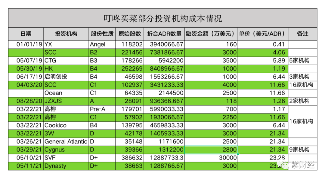紫财经梳理了叮咚买菜近两年来的融资价格变动历程发现,2019年,该公司按当前的ADR计,融资价格在4.1-6.4美元之间,从次年的4月直至今年3月,叮咚买菜的主流融资价格也不过11.7美元左右,其间还夹杂1.2美元等超低的价格,让人非常费解。