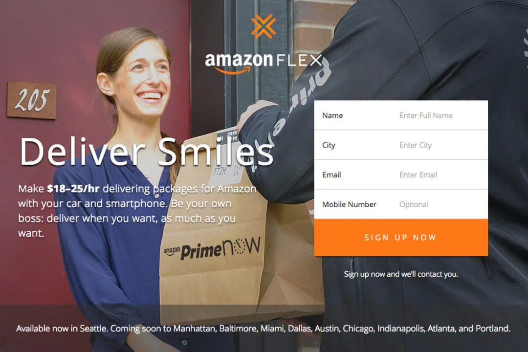 2015年,亚马逊推出了亚马逊Flex,就类似于网约车或者外卖骑手,帮助亚马逊送快递(末端配送)。