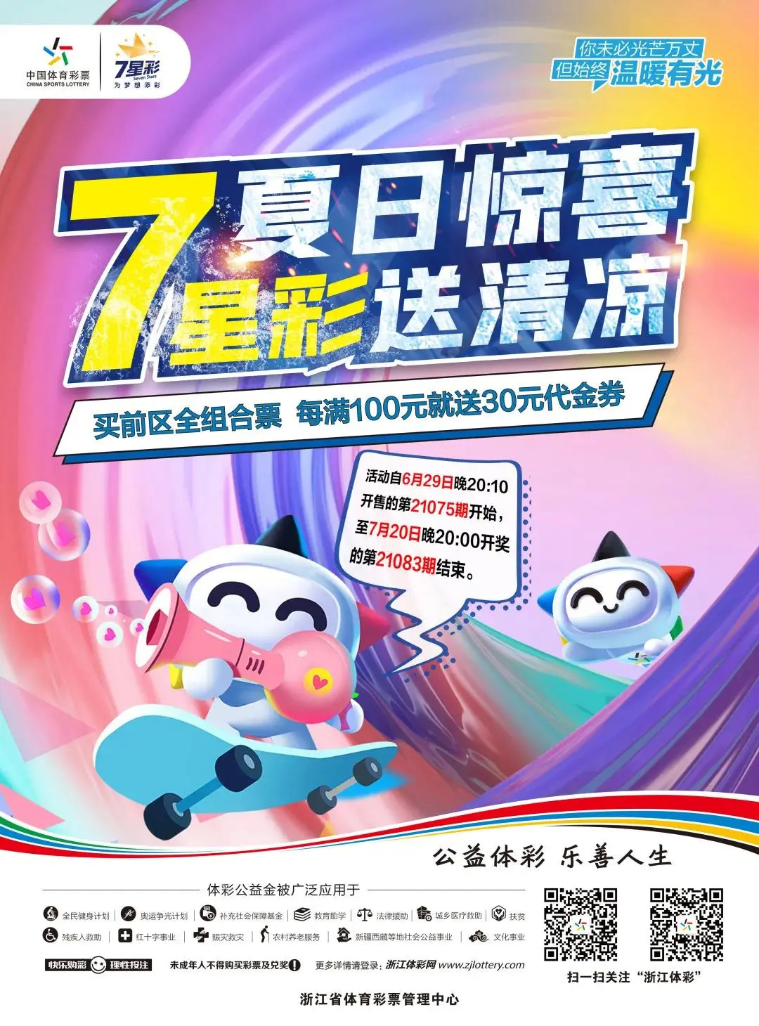 值得一提的是,7星彩夏日送清凉活动已于6月29日晚20:10开售的第21075期开启!只要您购买7星彩前区全组合票,每满100元就送30元代金券。