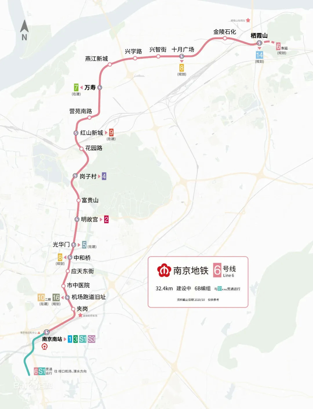 南京地铁6号线贯穿南京城北,从紫金山南侧直抵南部新城至南站,全长32.365公里,共设18站,均为地下站,未来或与既有的地铁S1贯通运行,原计划将于2024年建成,最新消息称将于2023年完成建设,比原定预计时间提前1年。