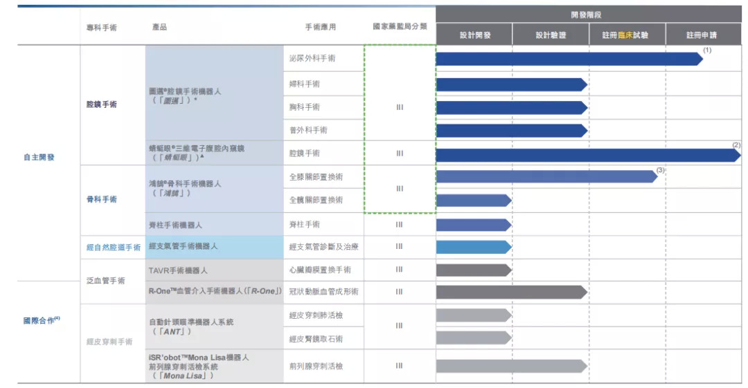 据了解,通过内部开发及国际合作,微创医疗机器人目前有9款产品处于不同的临床或临床前研究阶段。其中,除了一款为已获批准产品,其余八款均为处于不同开发阶段的候选产品,包括一款处于国家药监局注册申请阶段的候选产品、一款已完成注册临床试验患者入组的候选产品及六款处于临床前研究的候选产品。