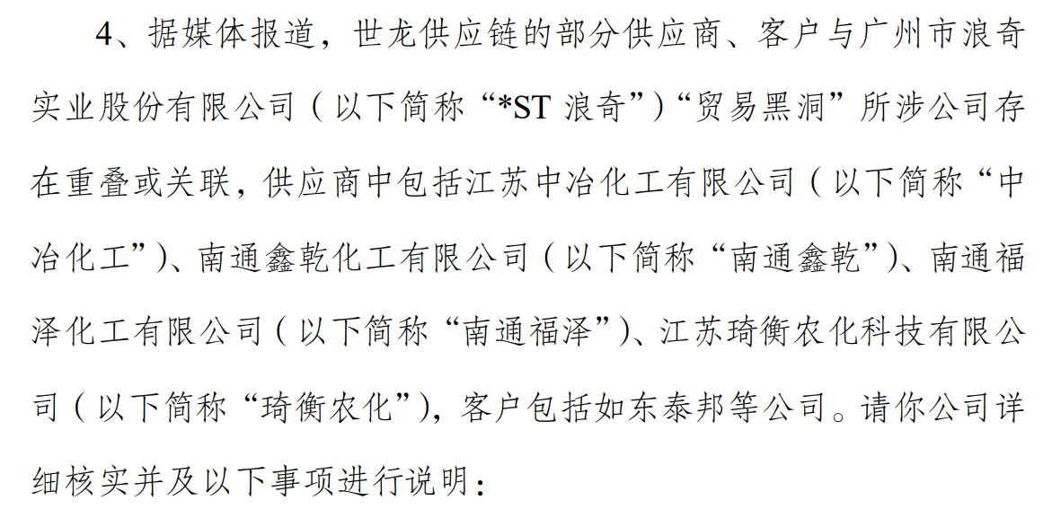 此前界面新闻曾发布《【调查】世龙实业诸多蹊跷,掉进广州浪奇式“贸易黑洞”?》报道,通过调查发现世龙实业的贸易业务,与广州浪奇(000523.SZ)的“贸易黑洞”案件有诸多交集,世龙实业的贸易业务中,其贸易对象与广州浪奇出现“贸易黑洞”的贸易对象是同一批公司、同一批人。
