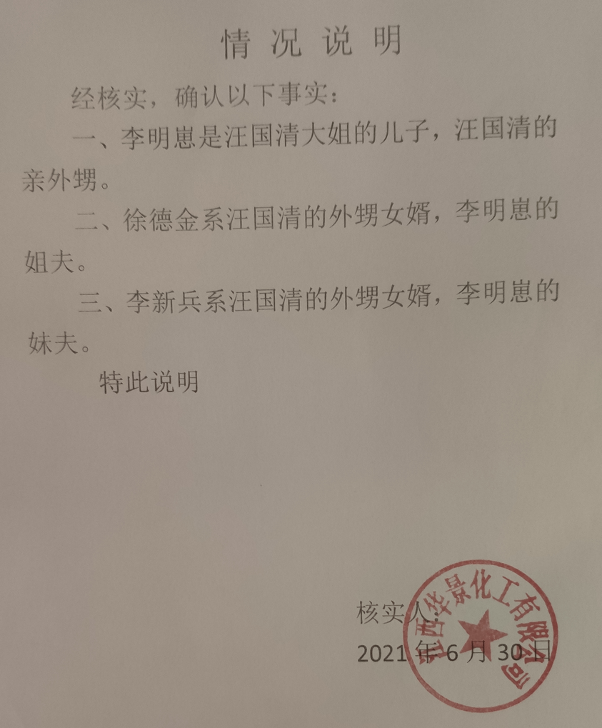 这些事件为何与汪国清扯上关系呢?据悉,乐平东豪股东之一的徐德金,实为汪国清的外甥女婿,举报人表示有确切证据证明汪国清是乐平东豪的实际控制人。