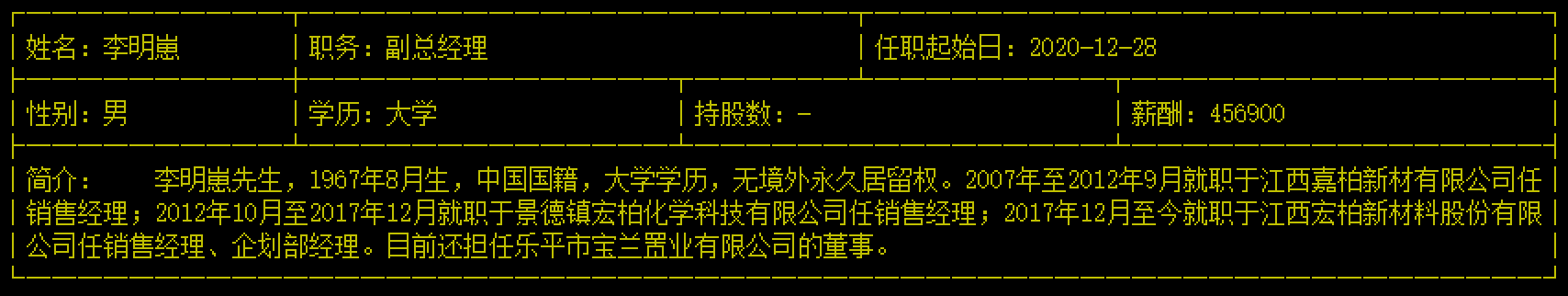 根据此前华景化工的核实信息,李明崽实为汪国清大姐的儿子,系汪国清的亲外甥。同时,李明崽也在宏柏新材任职副总经理,任职起始日为2020年12月28日。此外,天眼查显示,汪国清也是宝兰置业的董事。李明崽与汪国清任职多次产生交集。